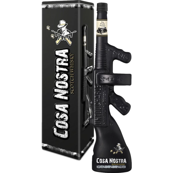 Το Cosa Nostra Tommy Gun είναι ένα σκωτσέζικο ουίσκι εμφιαλωμένο σε ένα πολύ πρωτότυπο μπουκάλι σε σχήμα όπλου, αυθεντικό αντίγραφο του Tommy Gun, ενός όπλου που χρησιμοποιήθηκε το 1920. Ήταν το αγαπημένο όπλο των θρυλικών αρχηγών του υπoκόσμου όπως ο Al Capone και ο Lucky Luciano. Το πολυβόλο Thompson (περισσότερο γνωστό ως Tommy Gun) είναι ένα αμερικανικό πολυβόλο που εφευρέθηκε για πρώτη φορά από τον John T. Thompson το 1918 κατά τη διάρκεια του Α’ Παγκοσμίου Πολέμου. Έγινε διάσημο κατά την εποχή της ποτοαπαγόρευσης, αποτελώντας χαρακτηριστικό όπλο διαφόρων συνδικάτων του οργανωμένου εγκλήματος στις Ηνωμένες Πολιτείες. Εκεί όπου η Μαφία έπαιξε πρωταγωνιστικό ρόλο στη διακίνηση αλκοόλ, ιδιαίτερα ουίσκι, με λαθραία αποστακτήρια σε όλες τις Ηνωμένες Πολιτείες. Πρόκειται για ένα διακριτικό αλλά ισχυρής γεύσης ουίσκι, το οποίο έχει παλαιώσει τρία χρόνια.
