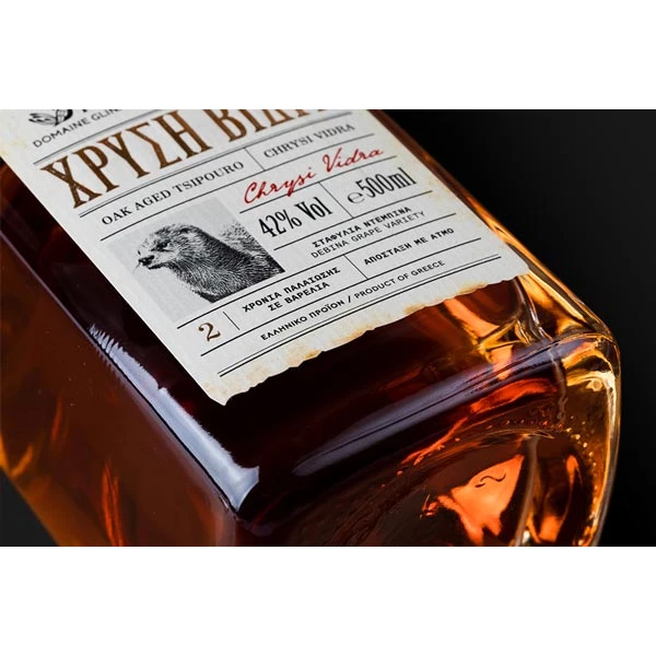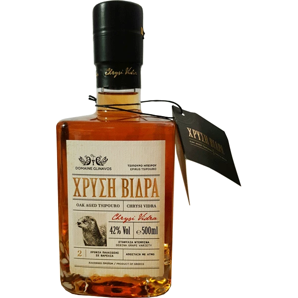 Η Χρυσή Βίδρα παράγεται από ζυμωμένα στέμφυλα της ποικιλίας Ντεμπίνα. Είναι προϊόν αργής απόσταξης με ατμό σε χάλκινους άμβυκες που στη συνέχεια παλαιώνει σε δρύινα Γαλλικά Βαρέλια στα οποία έχει προηγηθεί ερυθρή οινοποίηση.